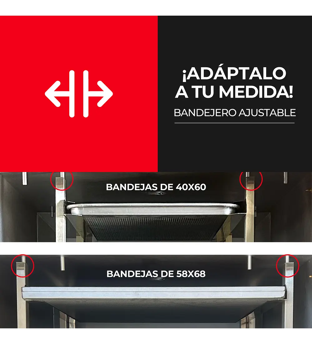 - Soporte para bandejas de 580 x 680 mm en acero inoxidable reforzado.