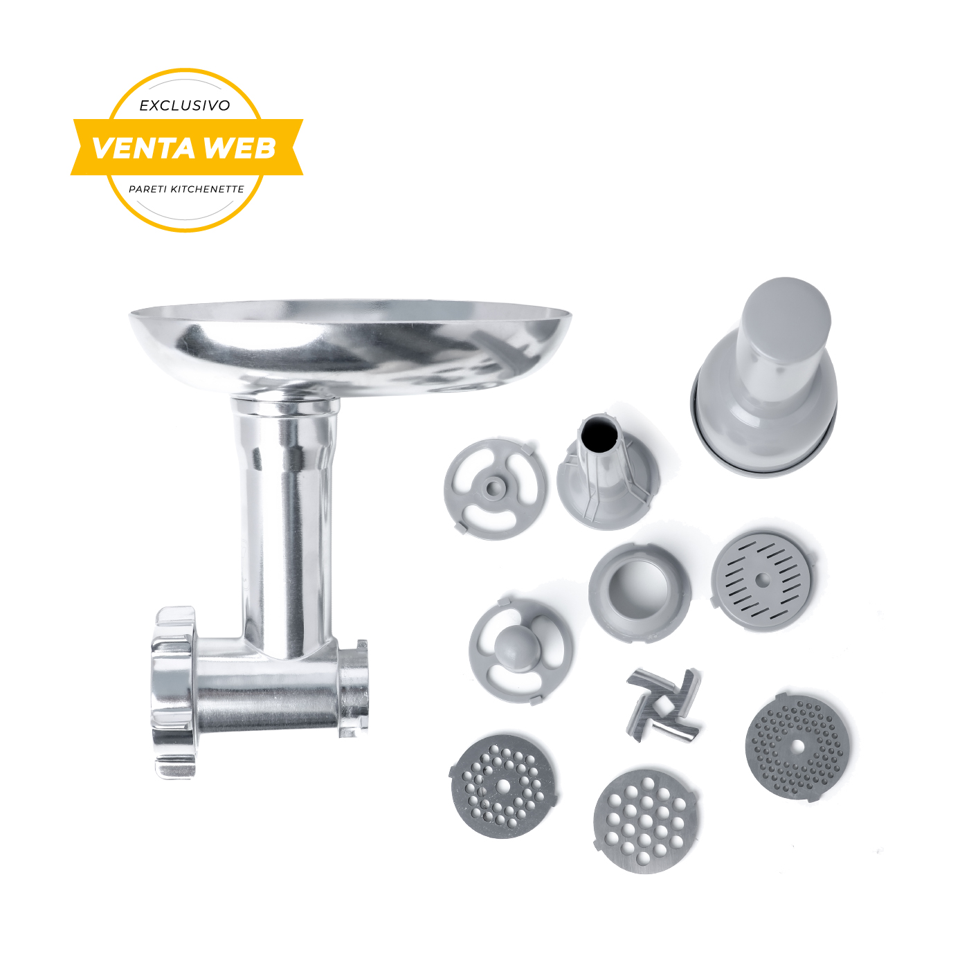 Este accesorio te permitirá moler carne con mucha facilidad y podrás hacer preparaciones como hamburguesas caseras, zapallitos rellenos, etc. Su cuerpo completamente de acero inoxidable lo hará mucho mas duradero, además cuenta con empujador y embutidor para facilitar al momento de ocuparla.