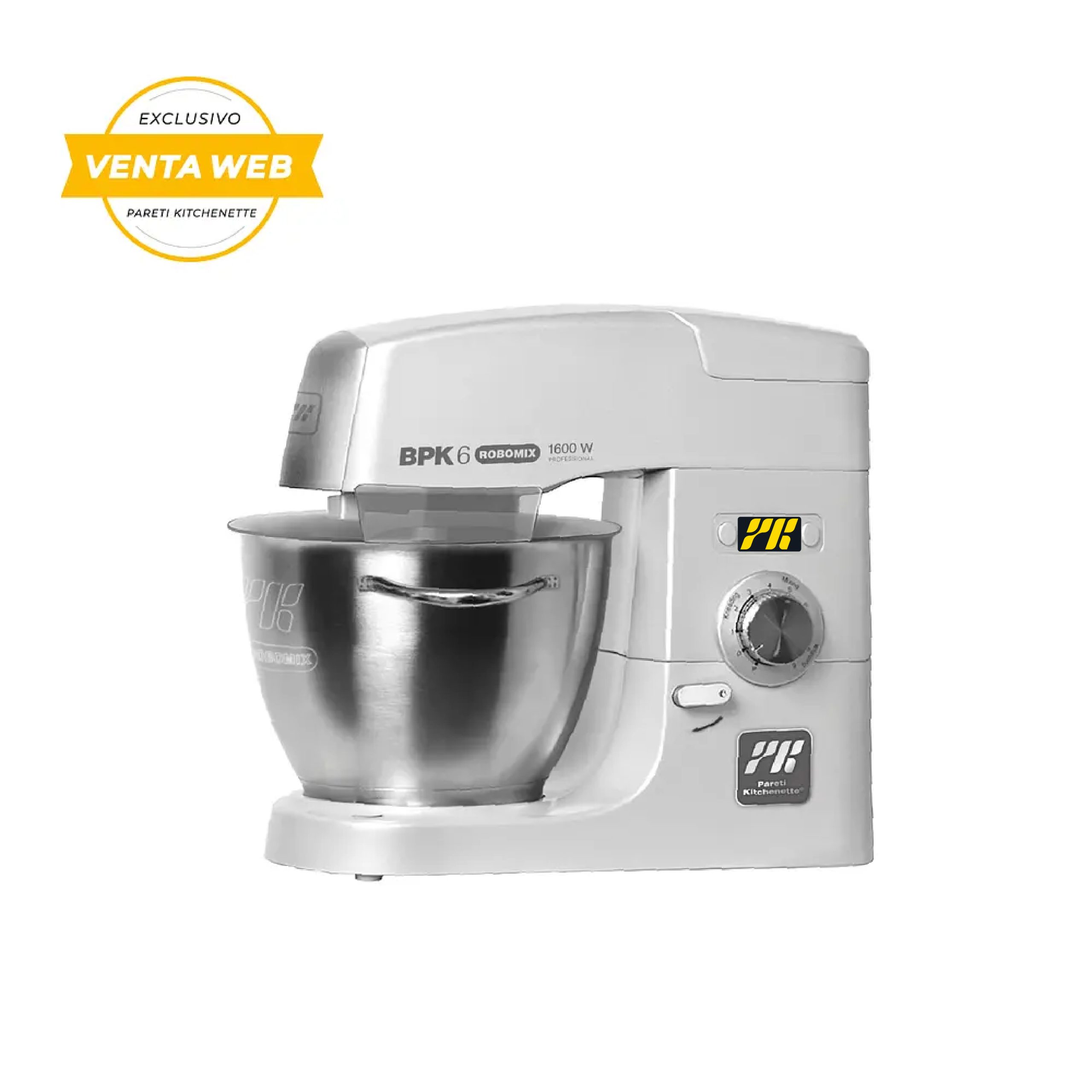Tú batidora BPK-6 ROBOMIX profesional ahora con 1600 W / 9 VELOCIDADES. Con la batidora BPK 6 podrás realizar mezclas blandas, permitiéndote facilitar el proceso de batir, mezclar y amasar alimentos. La Batidora BPK 6 de Pareti-Kitchenette® cuenta con una capacidad máxima de 6 lts en su bowl, en donde su capacidad para batir mezclas blandas es de