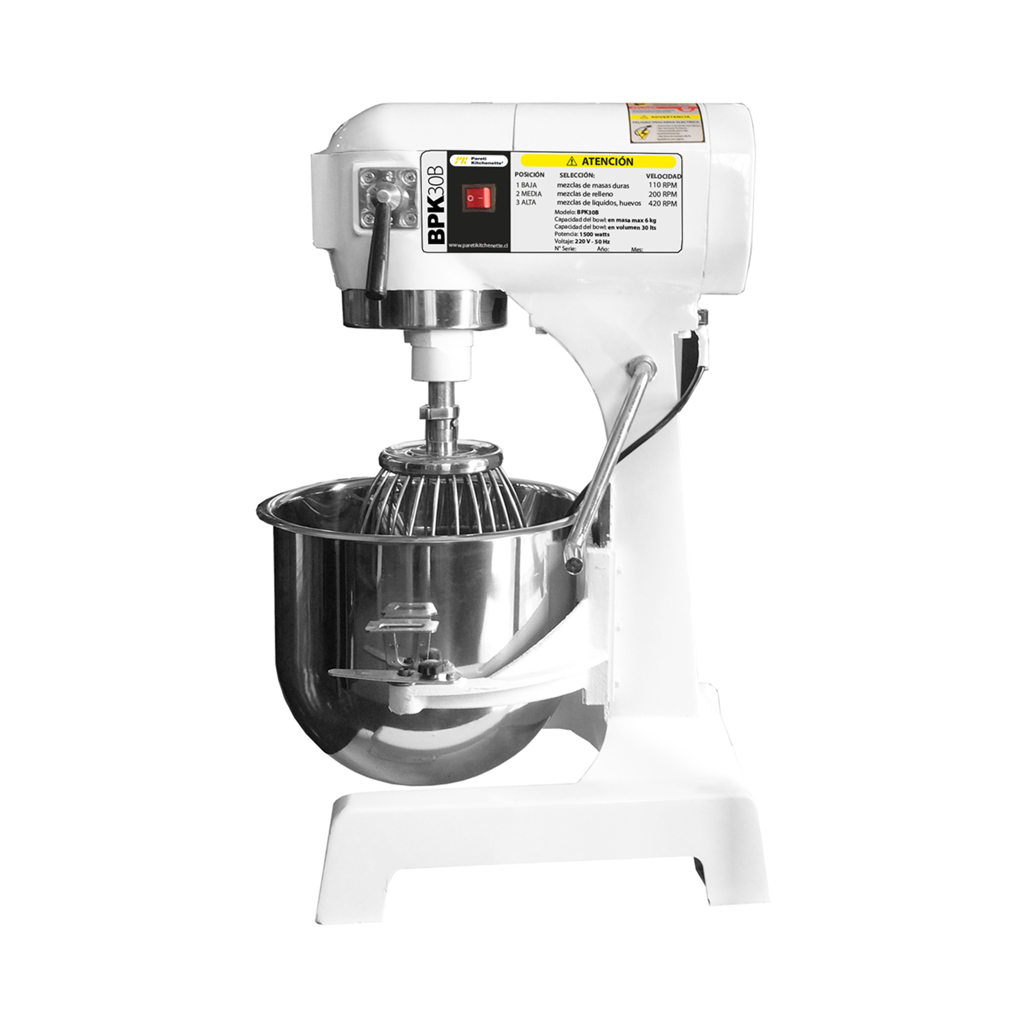 Las batidoras planetarias modelo BPK de Pareti-Kitchenette® son fabricadas con productos que le entregan calidad y durabilidad. Al ser una batidora industrial te permitirá generar mezclas más homogéneas debido a sus diferentes velocidades, 110, 200 y 420 rpm. Con las batidoras BPK industriales podrás reducir el esfuerzo físico y los tiempos de producción. Nuestra batidora modelo BPK industrial tiene capacidad para 30 lts en su bowl siendo este fabricado en acero inoxidable. La batidora permite hacer mezclas desde los 3,5 kg a 6 kg.