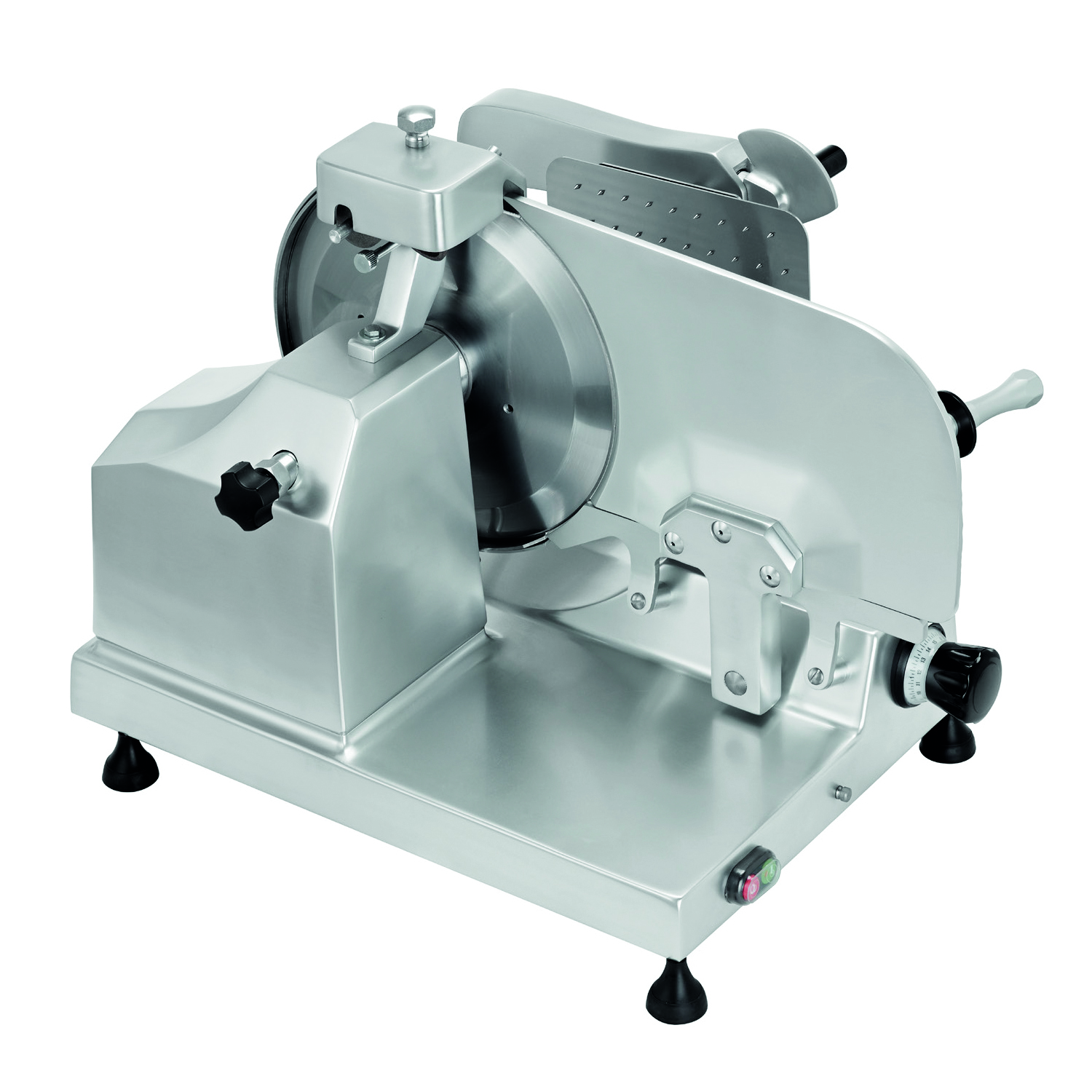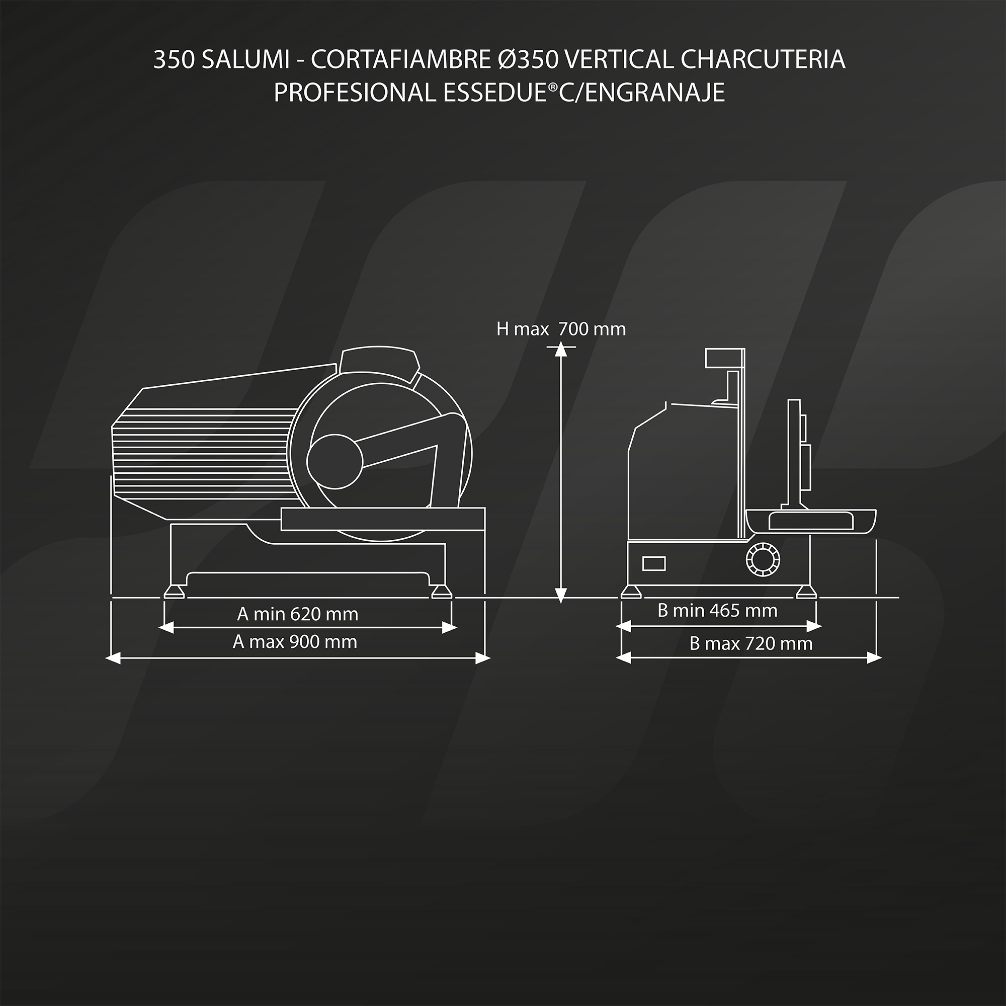 CORTAFIAMBRE Ø350 Vertical Charcutería Profesional C/Engranaje es una potente cortadora vertical y manual perfecta para cortar jamón y carne curada. Robusta y de alto rendimiento. Fácil de usar y limpiar. Ideal para gastronomías, supermercados y cocinas de gran amaño. La transmisión por engranajes asegura la máxima potencia cuando es necesario cortar productos duros. Estructura de aluminio anodizado. Cuchilla de acero al cromo endurecido de alta calidad. Carro especial para jamón y carne curada. Motor de uso continuo potente y silencioso. Transmisión de engranajes: larga vida, sin mantenimiento. Amplio espacio entre la parte posterior de la cuchilla y la base que permite el acceso para una fácil limpieza. Afilador incorporado, extraíble para su limpieza. Amplia área de colección de rebanadas.