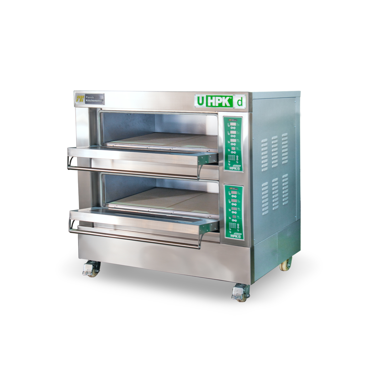 Equipado con un panel 100% digital, el U HPK-2/D ofrece un control preciso y fácil de usar en cada etapa de la cocción. Con capacidad para 4 bandejas y 4 piedras de 40x60cm, este horno te permite aprovechar al máximo tanto las bandejas como las piedras para una versatilidad óptima en tus creaciones culinarias.
