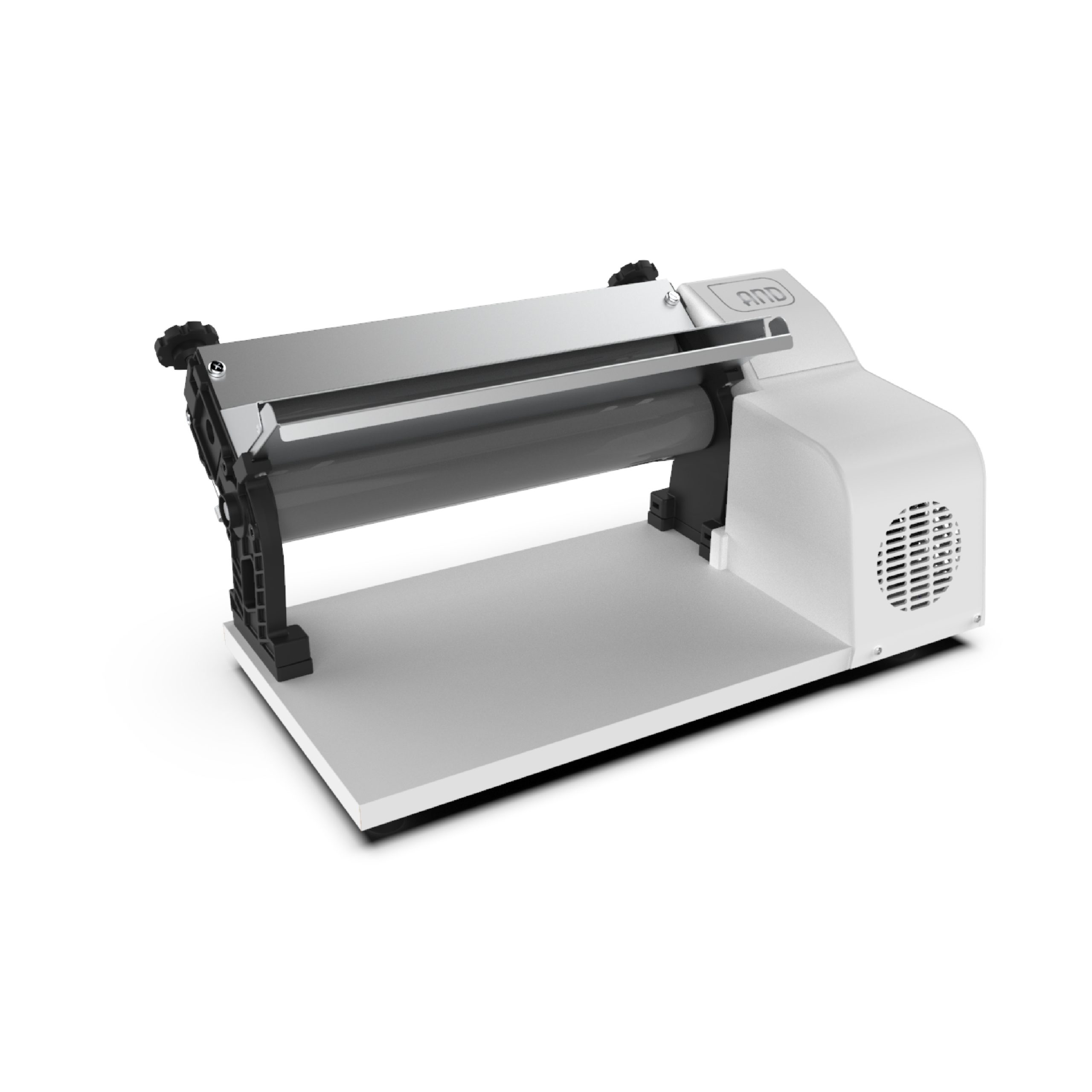 La base de MDF ofrece durabilidad y facilidad de limpieza, complementada con una chapa de protección amarilla que brinda mayor seguridad y prevención de accidentes. La mesa de apoyo inclinada a 45° facilita el laminado sin esfuerzo manual.