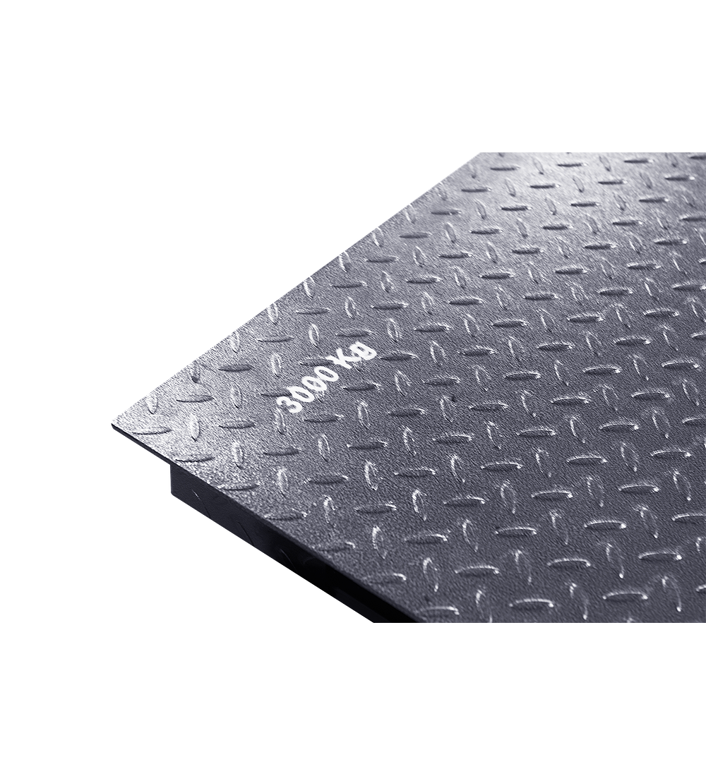Plataforma industrial de acero diamantado orientada al pesaje de pallets.
