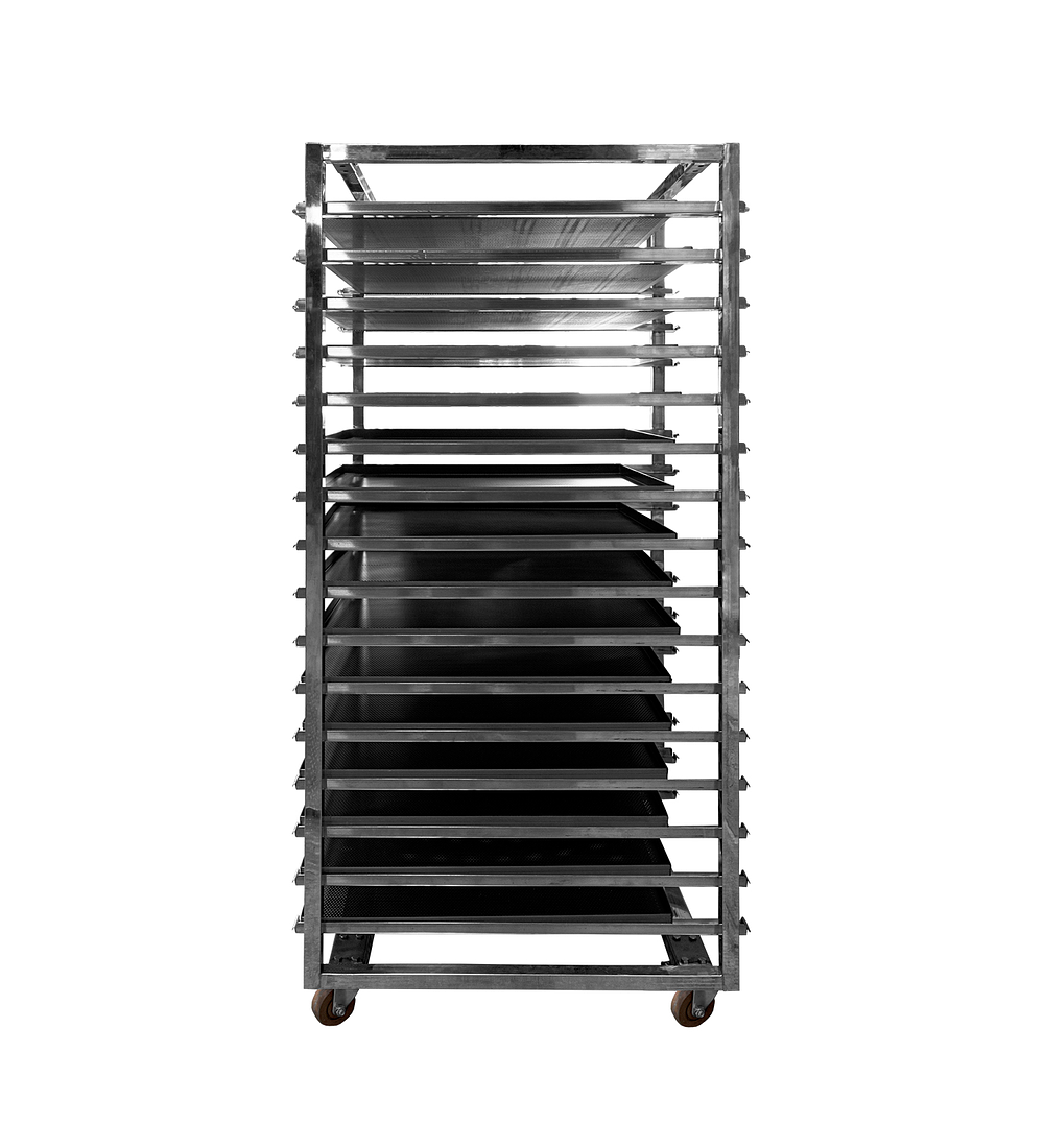 Perfecto para panaderías, pastelerías, cocinas industriales, y cualquier operación que requiera mover o almacenar productos en bandejas de gran formato de forma segura y eficiente.