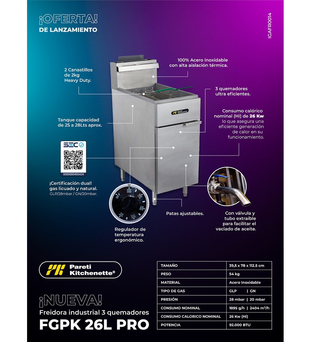 Con una combinación de materiales de alta calidad, características de seguridad y un diseño ergonómico, esta freidora a gas profesional de 26 litros es la elección ideal para chefs y propietarios de establecimientos que buscan un equipo confiable, eficiente y fácil de usar en su cocina comercial.